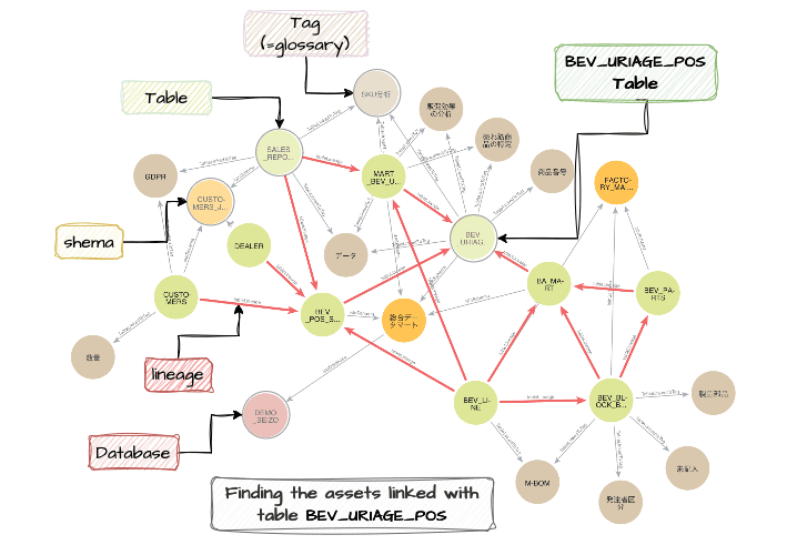 For example, Figure 3 in the previous section shows all the metadata linked by lineage, up to 3 hops away, with table “BEV_URIAGE_POS”, returned from the query: