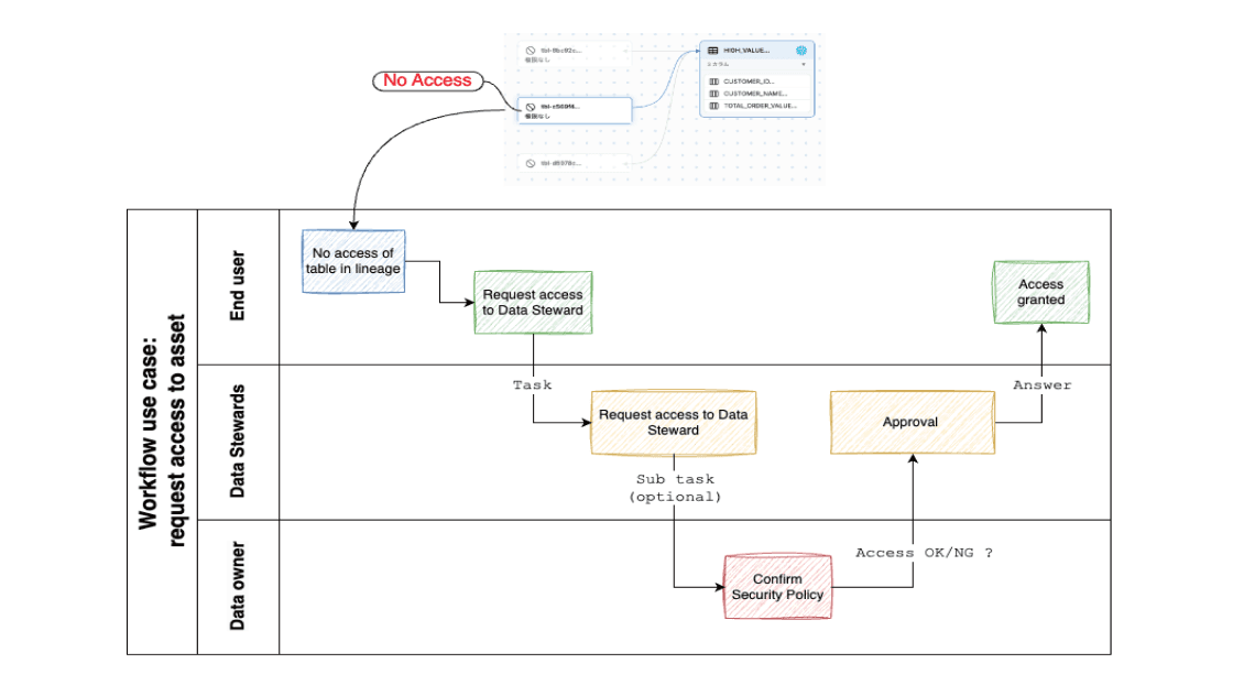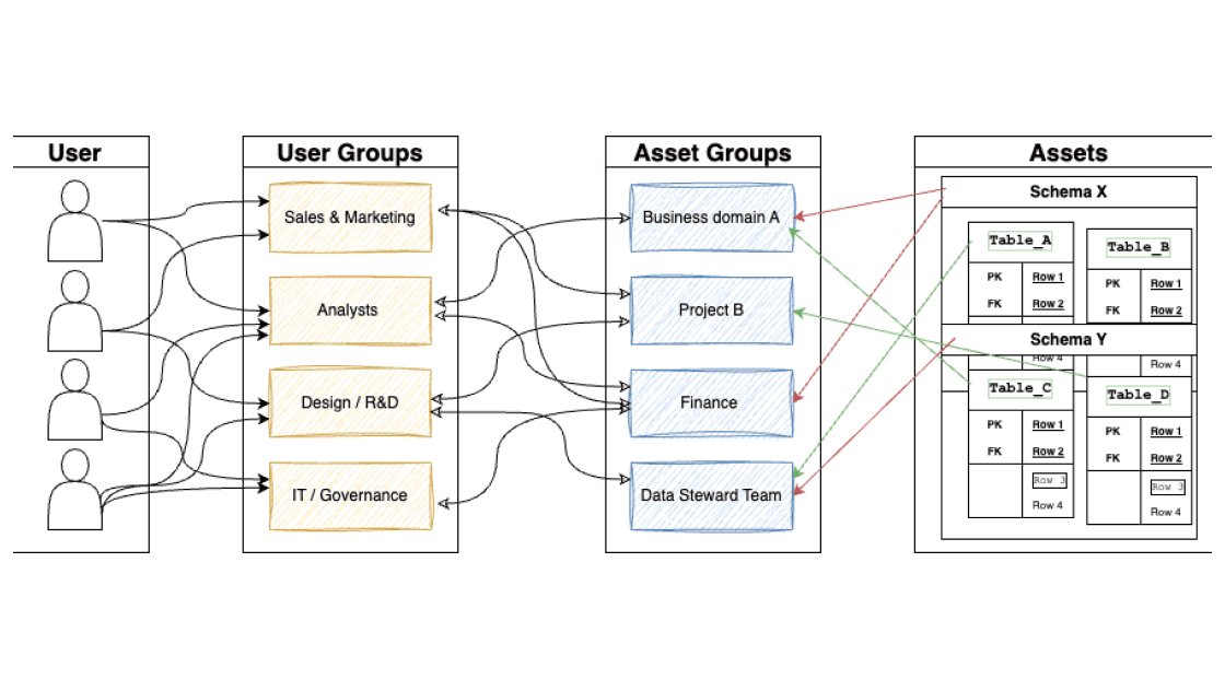 シンプルなメカニズムによるデータ資産へのアクセス制御と、職種に紐づけられたユーザーグループとデータ資産グループを組み合わせることで、細かいレベルでの制御を可能にし、さらにデータリネージやデータ品質などの機能に対してもコントロールを可能にします。