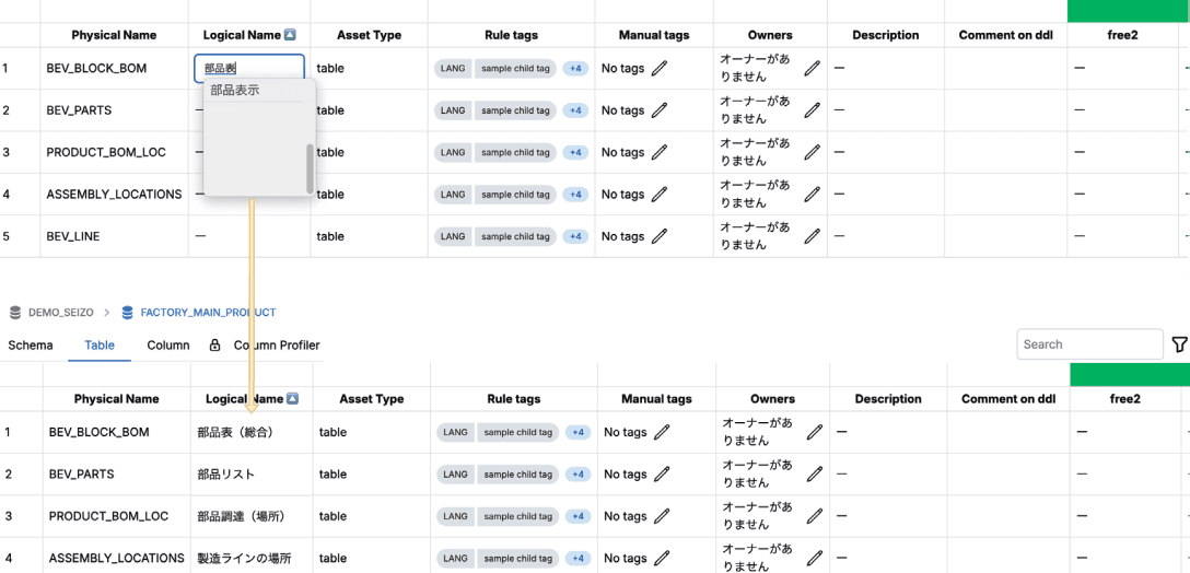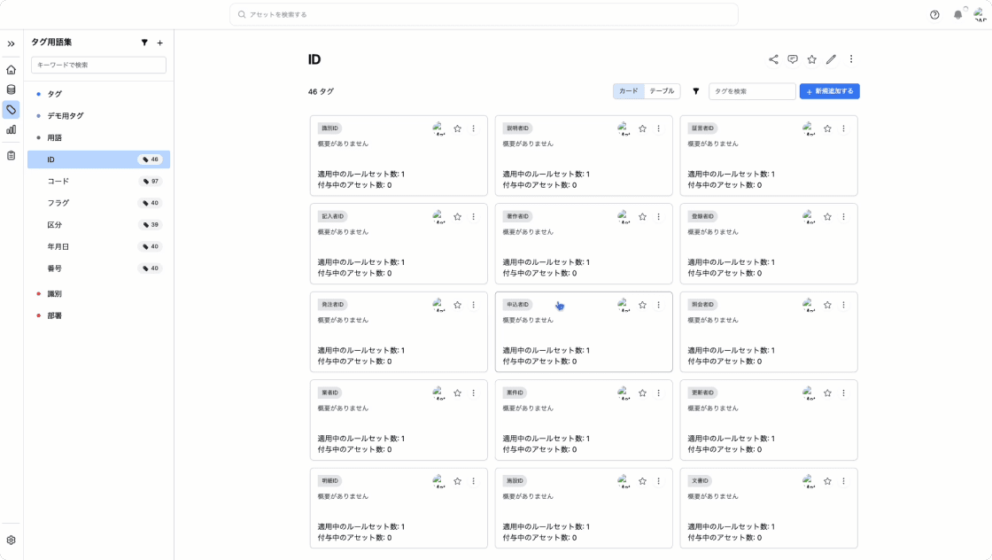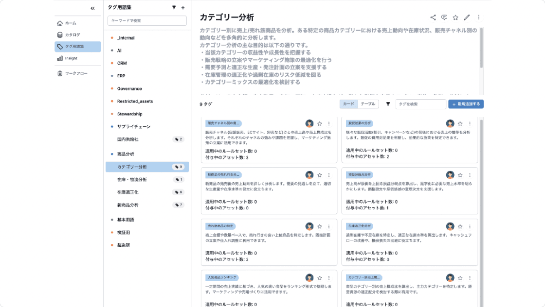 各データ資産に対して、日本および企業独自のビジネス用語や、利用用途やデータドメインに関する分類を自由に登録・追加することができます。これにより、データ資産に対する理解度の向上とクラスタリング、検索を容易にします。