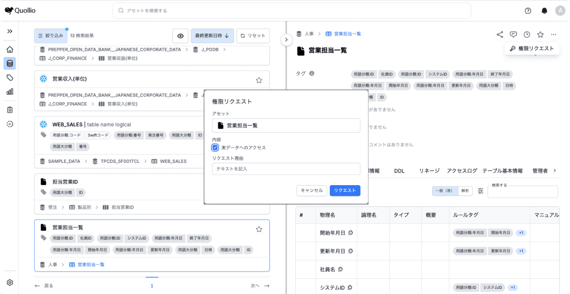 登録済みのデータ資産マーケットプレイスから容易にアクセス権限をリクエスト可能